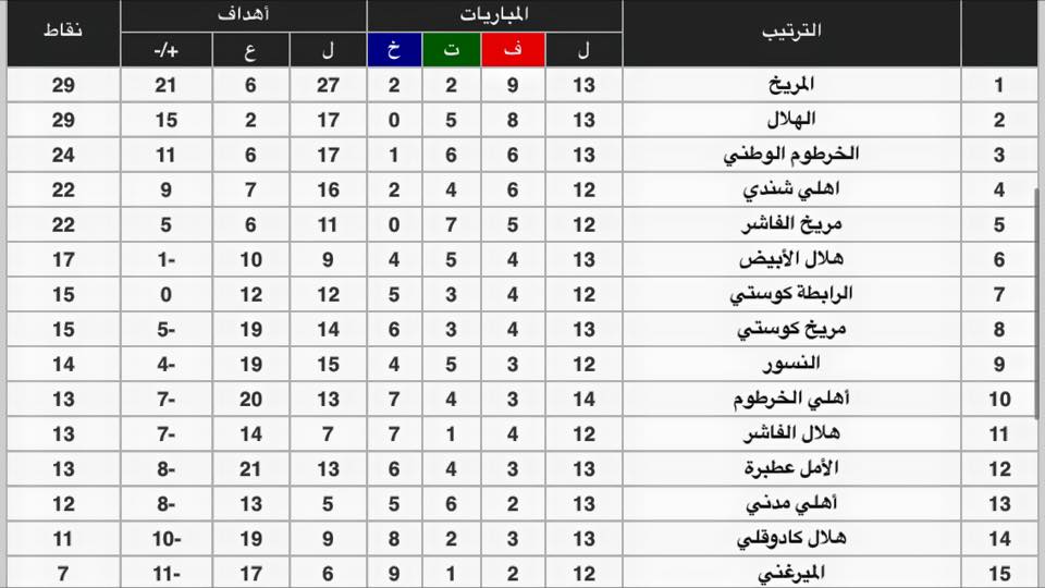 ترتيب الدوري السوداني الممتاز بعد نهاية الأسبوع رقم ١٤