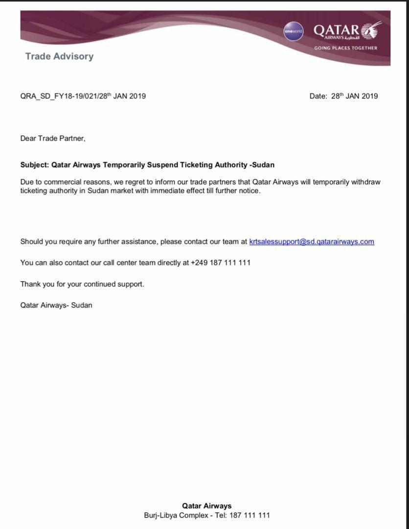 سودافاكس : في بيان مقتضب تحصلت شبكة سودافاكس على نسخه منه ، أعلنت الخطوط الجوية القطرية عن سحب وايقاف اصدار تذاكر السفر بالسودان .
