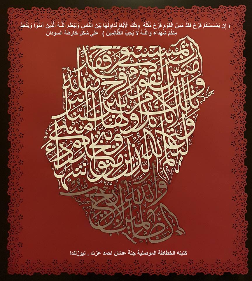 خاص- سودافاكس : في لوحة فنية عظيمة قامت الخطاطة العراقية جنة عدنان برسم لوحة تحصلت عليها شبكة سودافاكس وبها خريطة السودان و التي تضم جنوب السودان باستخدام الايات القرآنية وكتبت في الجزء العلوي ” السودان ” كتبت : قوله تعالى : إن يمسسكم قرح فقد مس القوم قرح مثله وتلك الأيام نداولها بين الناس وليعلم الله الذين آمنوا ويتخذ منكم شهداء والجزء السفلي الخاص بدولة جنوب السودان أكملت به الاية القرانية : والله لا يحب الظالمين