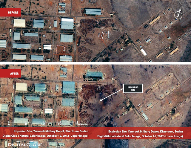 وتعرض مصنع اليرموك جنوبي الخرطوم، في أكتوبر 2012 لقصف من طائرات اسرائيلية، وفقا لاتهامات الحكومة السودانية، ما أدى لمصرع ثلاثة أشخاص على الأقل وإصابة آخرين بينما تضررت عشرات المنازل القريبة من موقع المصنع.