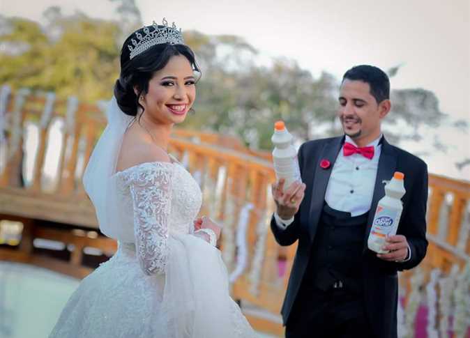 حرص عريس وعروس مصريين في يوم زفافهما على الحصول على صور تذكارية «فوتوسشن»، تطالب المواطنين بعدم التصافح أو بتبادل القبلات، من خلال حمل لافتة تحمل عبارة «مش هانسلم.. مش هانبوس.. مش هاننقل الفيروس»، بالإضافة إلى ارتداء الكمامات، وحمل زجاجات التعقيم.