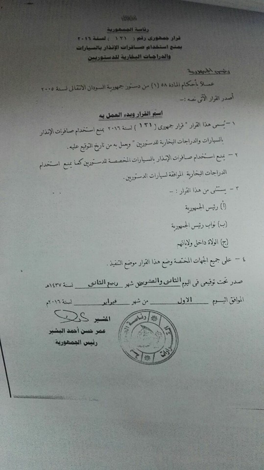 سودافاكس – الخرطوم : أصدر المشير عمر البشير رئيس الجمهورية قراراً جمهورياً يحمل الرقم 131 لسنة 2016 ، يمنع استخدام صافرات الانذار “السارينة ” بالسيارات والدراجات اليخارية للدستوريين .
