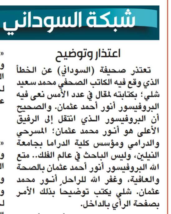 اعتذرت صحيفة السوداني الصادرة بالخرطوم ، عن الخطأ الذي ارتكبه احد صحفييها وقام بنعي البروفسور انور احمد عثمان خبر الفلك ، في عمود صحفي .