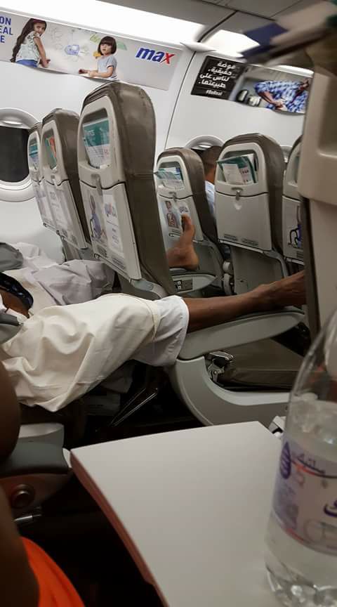أثارت صورة نشرت على صفحات مواقع التواصل الاجتماعي فيسبوك ، اثارت ضجة واسعة ، وذلك بسبب التصرف الغريب الذي قام به راكب سوداني بطائرة فلاي دبي رحلة الرياض- الخرطوم .