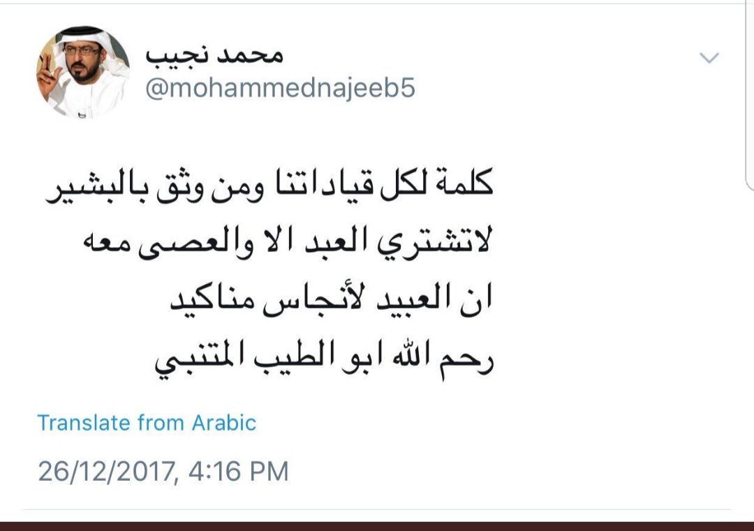 وقال الإعلامي الإماراتي في إحدى تغريداته: “كلمة لكل قياداتنا، ومن وثق بالبشير.. لا تشتر العبد إلا والعصا معه، إن العبيد لأنجاس مناكيد.. رحم الله أبا الطيب المتنبي”.