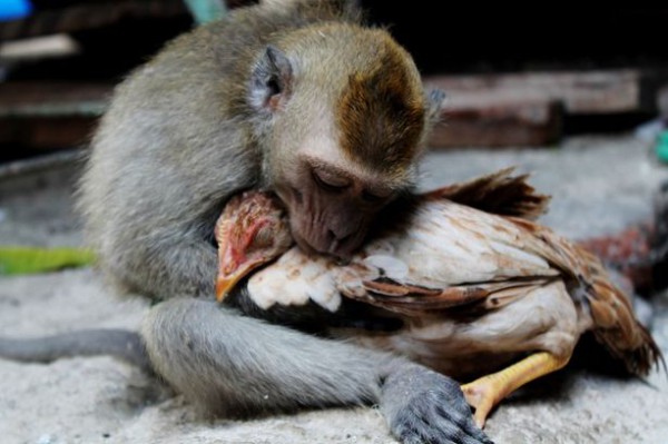 وقع قرد في غرام دجاجة من النظرة الأولى، حين شاهدها في سوق محلية بجزيرة جاوا الإندونسية، بينما كان برفقة مالكه.
